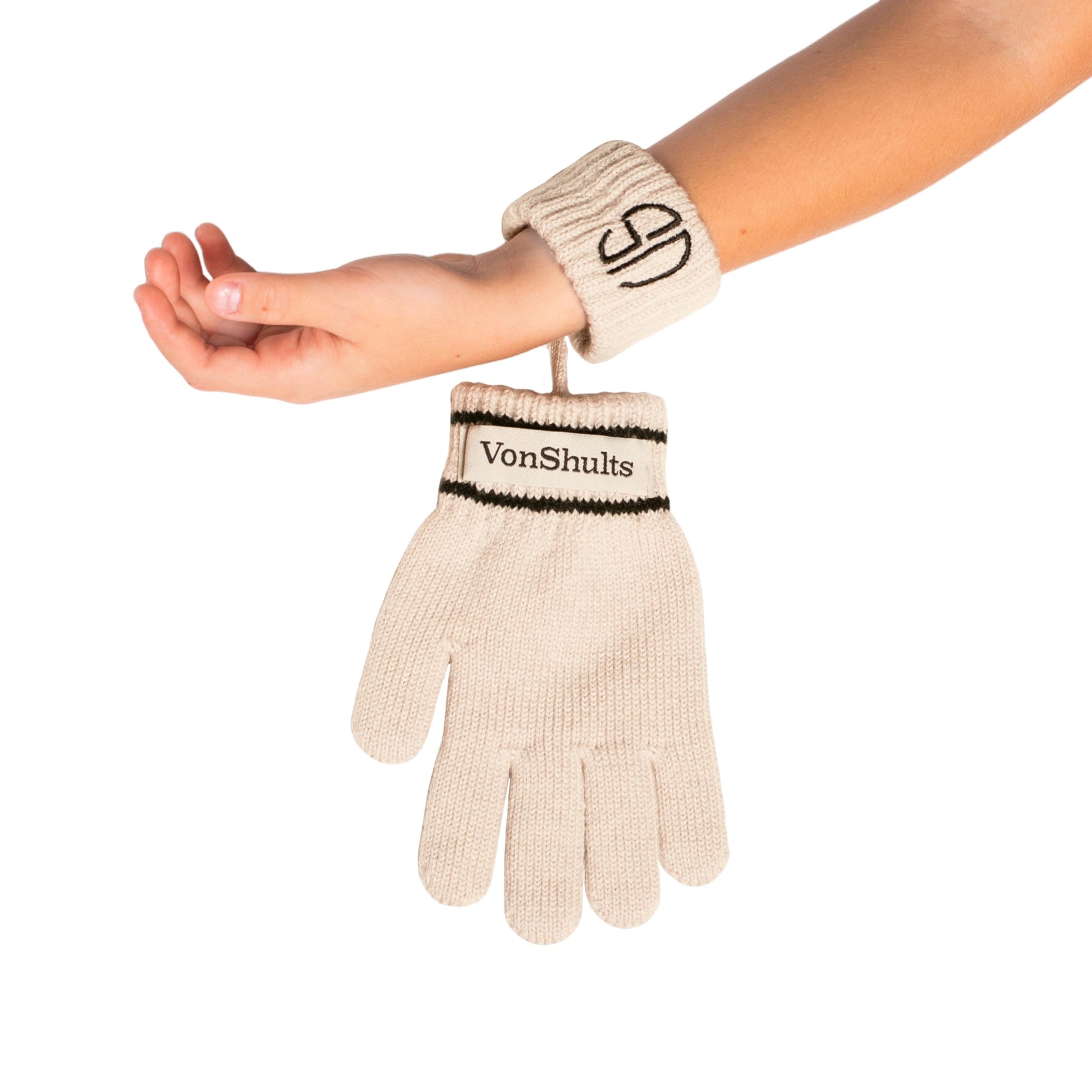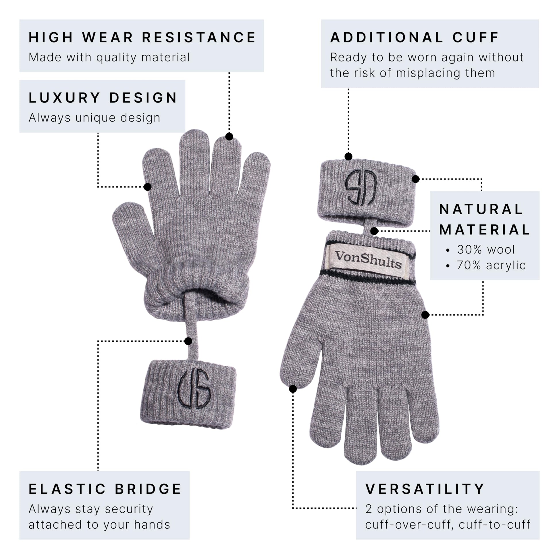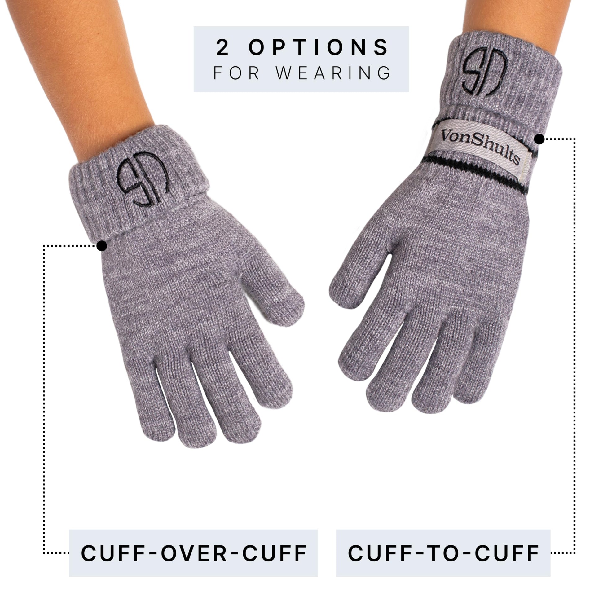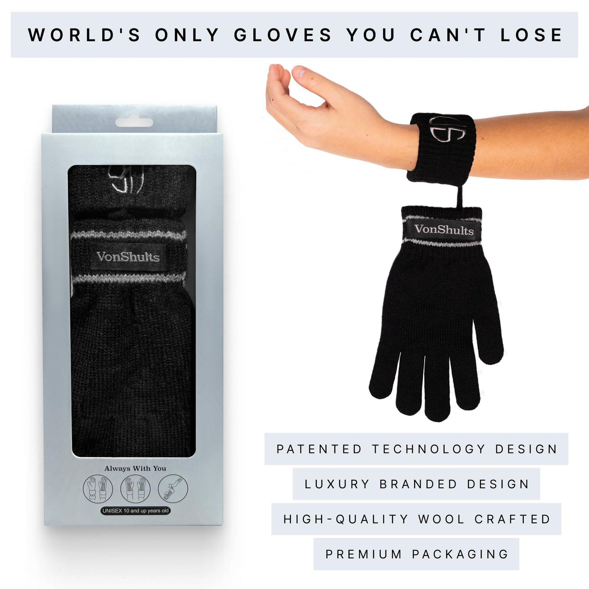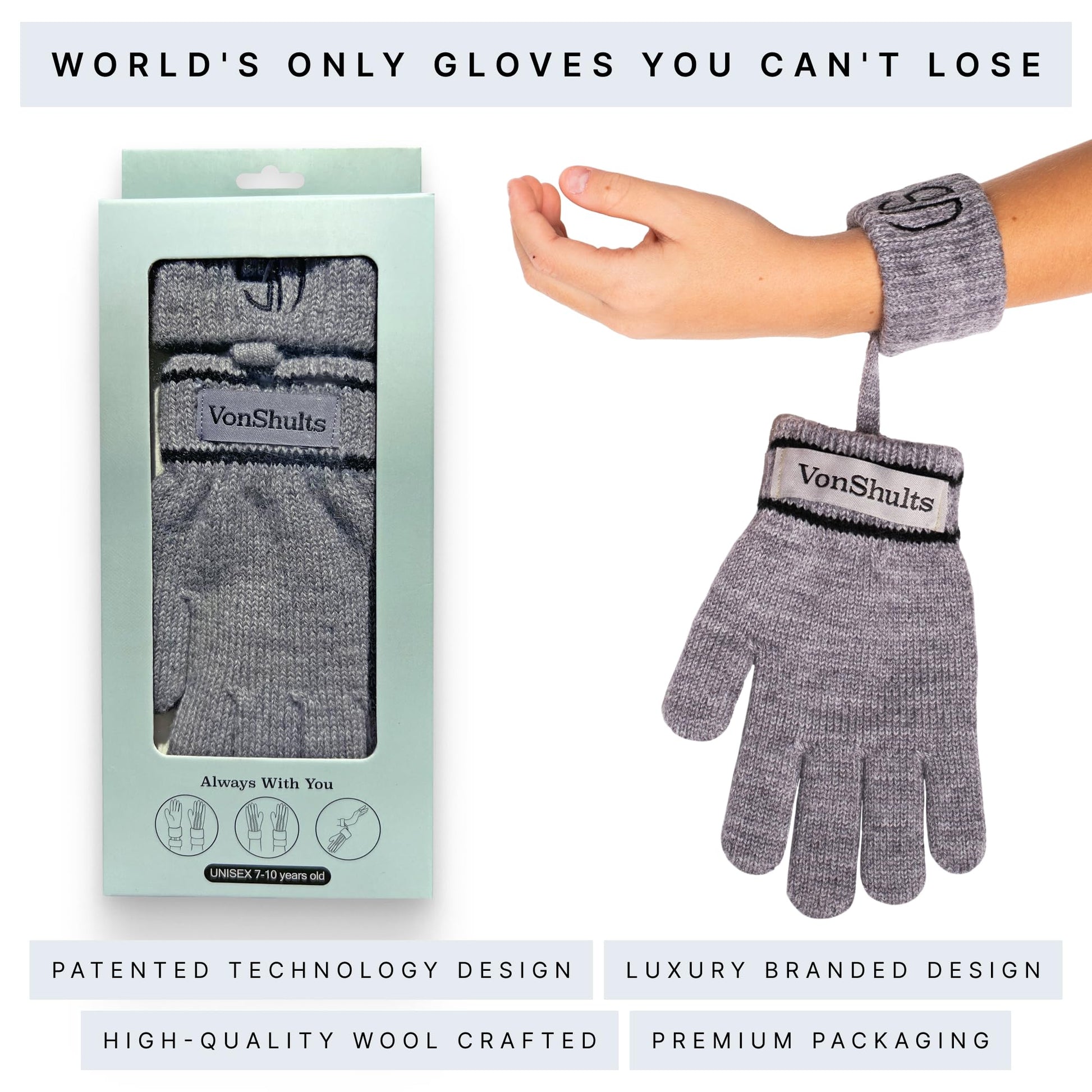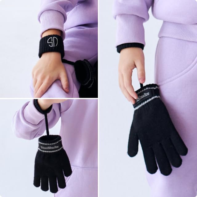 VonShults Merino Wool Winter Gloves Kids Teens with Wrist Strap Strings No Clips - Never-Lose Warm Cold Weather Mittens with Band Cord
