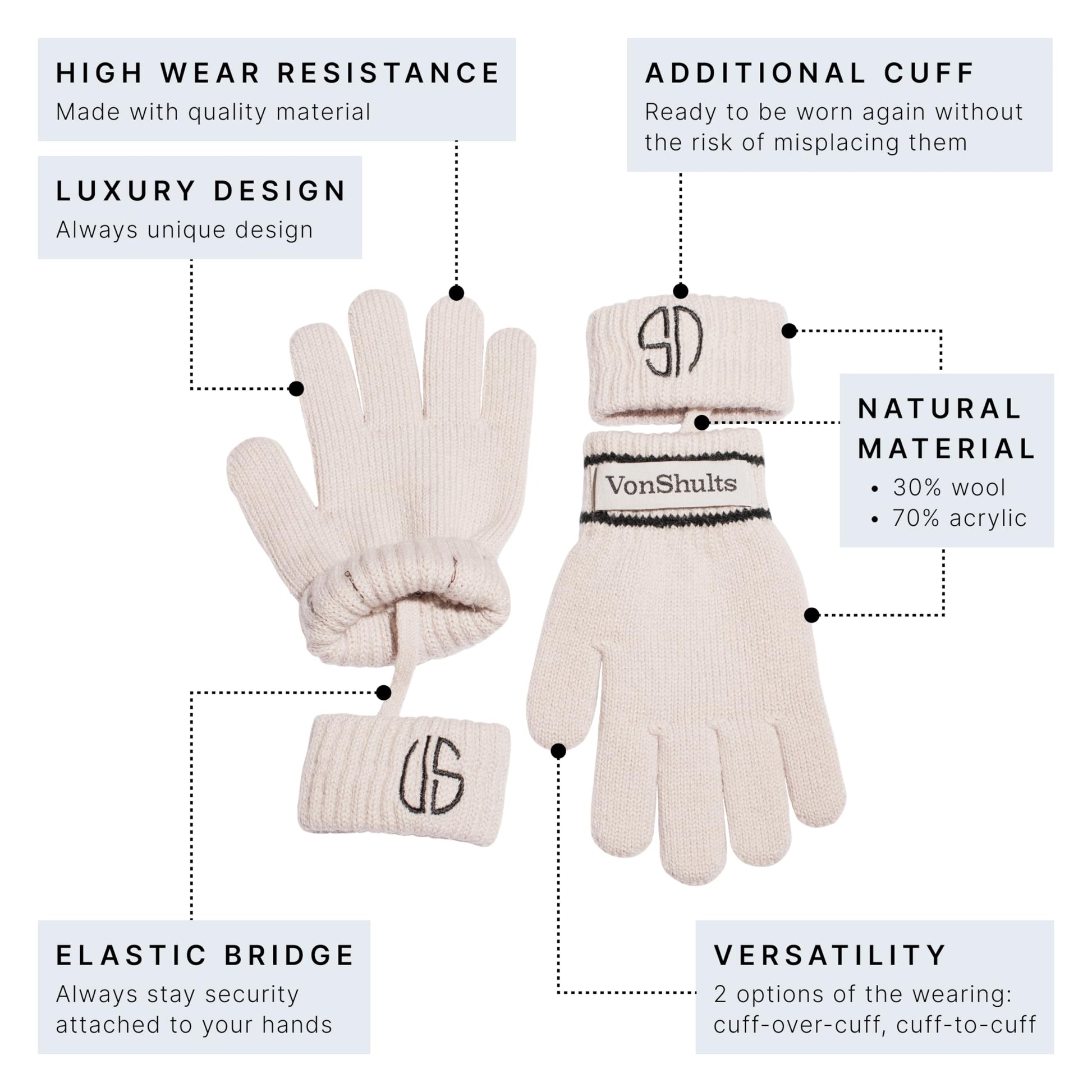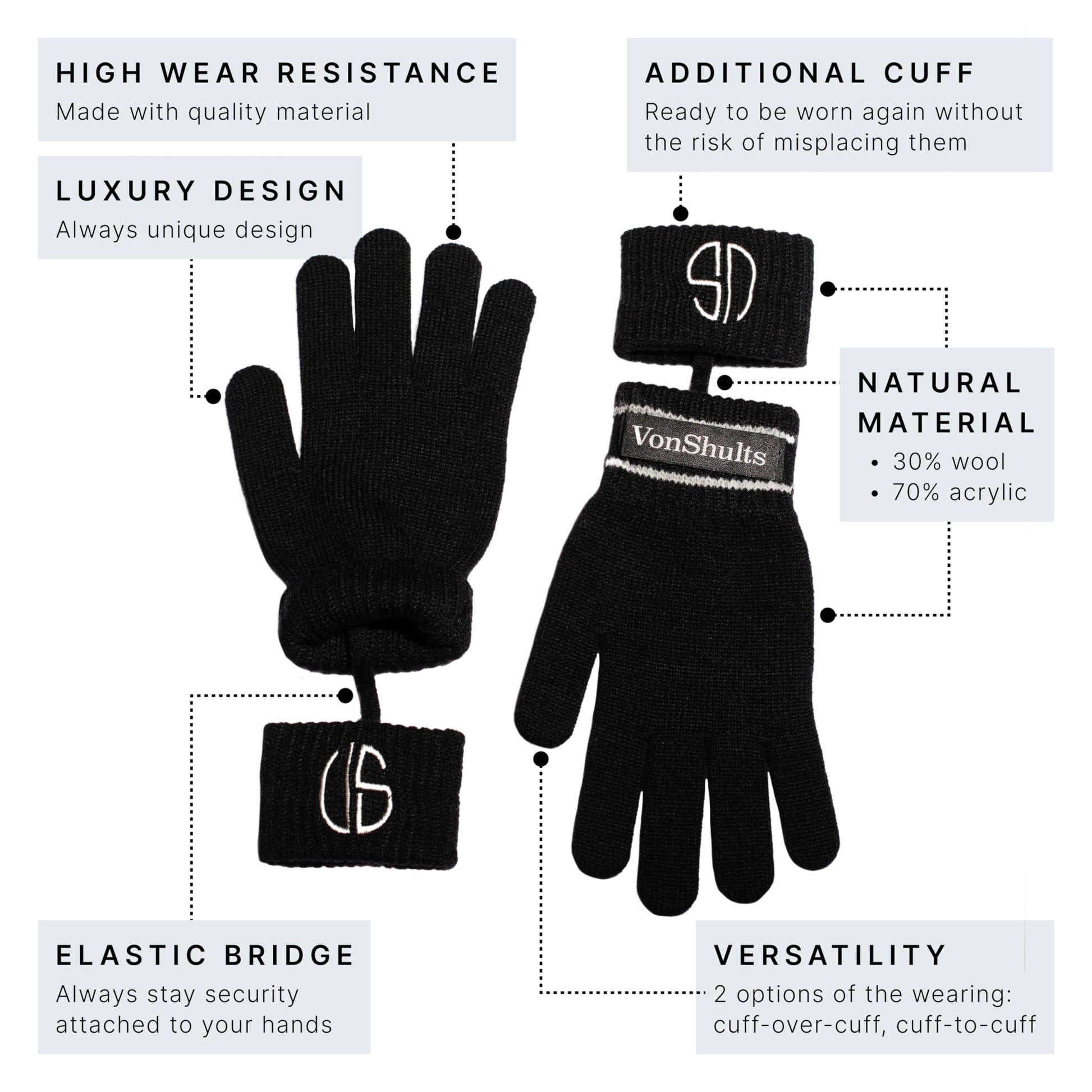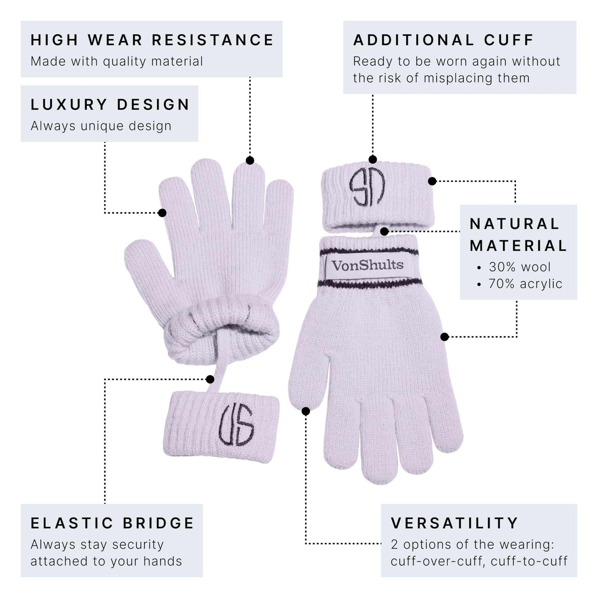 - Unique Design. Our toddler mittens and kids’ gloves stay securely in place thanks to a built‑in elastic bridge (wrist holder) and additional cuff. Wear them cuff‑to‑cuff or cuff‑over‑cuff for two different styles. Clips and strings prevent the gloves from getting lost and keep them attached to jackets or each other.